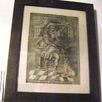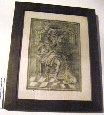 - Gravado coa imaxe de San Roque, a modo de estampiña devocional. Representa o seu tránsito. Baixo a iconografía habitual: no interior da cela de Vhogera, sentado sobre un banco, encadeado, vestido de peregrino, con chapeu no que loce a cruz aspada formada polas chaves de San Pedro propia dos romeiros, escraviña, o bordón e o can aos pés. O hábito deixa ver a característia chaga (e non bubón) pestilente na perna. Dous anxos na parte superior descobren unha filacteria con inscrición latina. Marco en madeira.