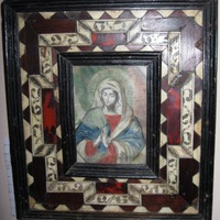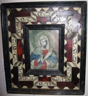- Litografía (posterior ao marco) coloreada da Virxe en actitude orante. Marco en marquetería de marfil e carei que segue un patrón xeométrico. De carácter devocional, trátase dunha representación das letanías marianas.