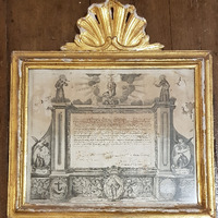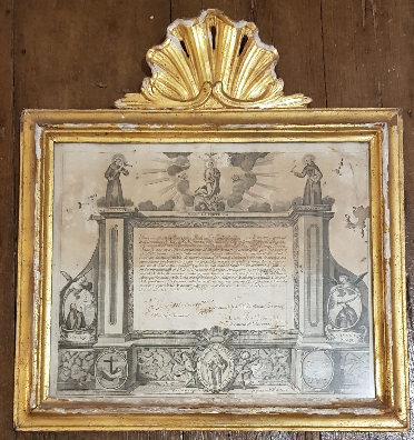 - Gravado sobre papel do célebre artista Ventura de Ágreda (1754-1786). Trátase dunha fe de hermandade concedida pola Orde franciscana a Francisco Losada Quiroga, a Francisca Bermúdez e ós seus irmáns. Asinada en San Diego de Valladolid, o 3 de marzo de 1789. Marco en madeira e estuco sobredourado con pan de ouro, rematado na parte superior cunha cuncha de vieira de gusto rococó.