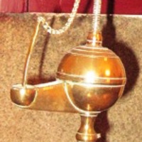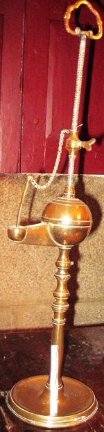 - Lámpada de aceite de pé circular e astil abalaustrado. O astil superior de parafuso regulable en altura. Co depósito esférico e dunha soa lapa. Conta cunha cadea con tapador de lapa e asa superior de perfil mixtilíneo.