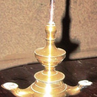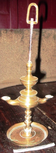- Lámpada de aceite en bronce de dúas lapas. De pé circular e astil abalaustrado, ensanchado na parte media para acoller o depósito.