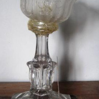 - Lámpada de petróleo en cristal de roca coa base en forma pentagonal e fanal floriforme.