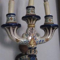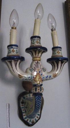 - Candeeiro de parede de tres brazos en cerámica de Talavera en tonos branco, azul e ocre.