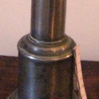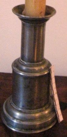 - Candeeiro de corpo cilíndrico, dunha soa luz, con repisa voada e moldura en anel na parte media. Pé circular exvasado. Todo en estaño.