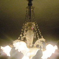 - Lámpada de teito en cristal tipo Real Fábrica de la Granja con cinco brazos con remate en tulipa de cristal.