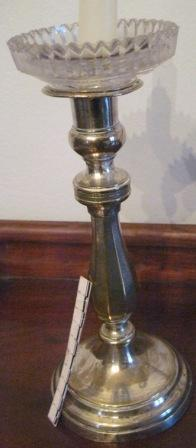 - Candeeiro en metal bañado en prata, dunha soa luz, de pé circular moldurado, astil abalaustrado e facetado, bocel superior con cenefa de grilanda de láureas repuxadas e entrelazadas e prato voado en cristal.