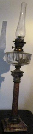 - Quinqué de pé cadrangular de dos escanos decrecentes e astil en forma de columna de orde composta de marmolina veteada co seu capitel en aliaxe de chumbo fundido en molde; o depósito en cristal tallado co seu chisqueiro en bronce e latón da marca Kosmos Brenner. A tulipa en cristal, lotiforme. A marca alemá Kosmos Brenner empezou a denominarse así cando, a finais do século XIX, Brökelmann, Jaeger & Co, de Neheim (Alemaña), comprou a marca "Kosmos" a Wild & Wessel, de Berlín. Kosmos foi o nome co que os lampistas alemáns Wild e Wessel sacaron ao mercado un novo queimador ou chisqueiro da su invención para lámpadas de petróleo. A toma de aire era de combustión lateral pero o sistema permitía levar o aire até o centro da lapa.