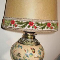 - Lámpada de sobremesa, antigo quinqué de gas adaptado á luz eléctrica, co pé e chisqueiro en bronce, o depósito de globo en porcelana decorada con flores e bolboretas en relevo esmaltado. Pantalla do século XX en tons ocres e cenefa con motivos florais.
