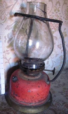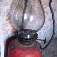 - Quinqué de gas con depósito en ferro de cor vermello, tulipa de cristal e chisqueiro en bronce.
