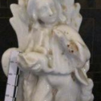 - Candeeiro en porcelana de cor branco, no corpo unha figura en relevo dun neno vestido de pastor.