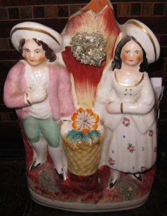 - Candeeiro en porcelana no corpo con dúas figuras en relevo, un home e unha muller que flanquean unha cesta. Posíbel voda campesiña.