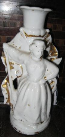 - Candeeiro branco e dourado con corpo en relevo cunha figura feminina detrás da que asoman bandeiríns.