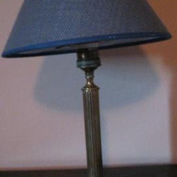 - Lámpada de sobremesa en bronce con pé circular sobre basamento escalonado, vástago en forma de columna de fuste acanalado e capitel estrangulado. A pantalla en tea azul.
