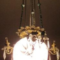 - Lámpada de teito, pantalla de vidro opalino rosa decorado con motivos florais e tres andoriñas, de evidente inspiración na estampa xaponesa, rematada na parte superior e inferior en bronce e con soporte para seis lámpadas, brazos calados dos que penden lágrimas de cristal.