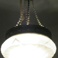 - Lámpada de teito coa súa tulipa en cristal opalino, de forma globular labrada con relevos xeométricos e vexetais. O resto da estrutura consiste nun corpo que recolle a tulipa en chapa de bronce repuxado con grilandas. Colga a través de seis cadeas decoradas con esferas de vidro unidas á copa superior, tamén en chapa.