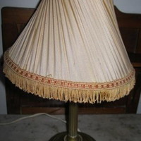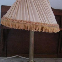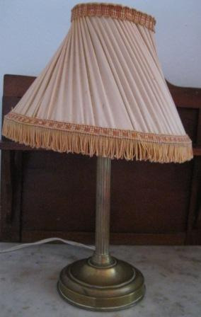 - Lámpada de sobremesa con pé en bronce, pé circular e fuste columnario acanalado; pantalla en tea de cor ocre rematada en flecos.
