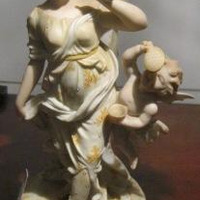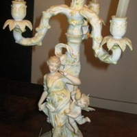 - Candeeiro de catro luces en porcelana tipo biscuit, orixinal da fábrica de Sitzendorf. Desmontábel en dúas pezas, base con figuración e vástago de remate, consta de tres brazos a maiores do central que remata a composición. Decorado con motivos florais e de rocalla, todo él en tons amarelos pasteis. O asunto iconográfico representado podería aludir ao amor no seu sentido tráxico en virtude do mito recreado, ainda que de acordo con esa estética rococó máis xuguetona, sofisticada e frívola que segue a peza, inspirada na pintura dun Fragonard ou dun Boucher, por exemplo. Represéntase a Psyche, ou alma humana, acompañada por un putto que poderíamos identificar con Céfiro, o vento enviado por Cupido para salvar á súa amada. Outra posibilidade é que se trate de Anteros, irmán de Cupido e personificación da vinganza do amor non correspondido. Ela vai ataviada cun chitón, coa cabeleira recollida nun moño e suxeito sobre da testa cunha cinta, e descalza. Os dous con ás de bolboreta, o seu atributo máis evidente (tanto de Psyche como de Anteros e o propio Céfiro). Onde a traxedia? Psyche e Anteros/Céfiro sopran pompas de xabrón, emblema clásico da fugacidade do tempo e polo tanto, do amor, coma así lle aconteceu a Psyche.