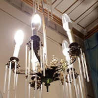 - Lámpada de teito en bronce, de brazos calados con decoración floral e de palmeta, dos que penden lágrimas prismáticas de cristal.