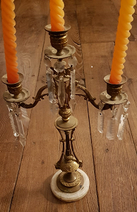 - Candeeiro de tres brazos, corpo en bronce e pé circular en mármore branco. Cada brazo conta co seu pratiño voado para recoller a cera, do cal penden prismas de cristal de roca facetados, a modo de lágrimas.