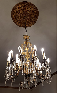 - Lámpada de teito con cinco brazos en bronce, con catro candeas para cada brazo e lágrimas prismáticas, facetadas, de cristal. Antigamente era de candeas e foi adaptada posteriormente á electricidade.