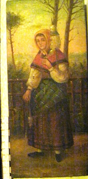 - Cadro costumista ó óleo pintado sobre táboa de castiñeiro que representa a unha muller fiando con traxe típico galego, asinado por Cándido Garabal. Sen marco.
