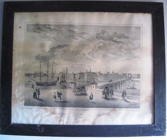 - Gravado litográfico de François Desiré Gosselin (activo entre os anos 1840-1869) que representa unha vista de Burdeos. Marco en madeira.