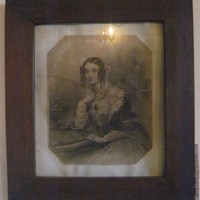 - Gravado de William Egleton a partir dun debuxo orixinal de John Hayter, retrato de pose artificiosa, arquetípica dos retratos oficiais dos primeiros anos da época vitoriana, de Elizabeth Catherine Gubbins, vizcondesa de Falkland e duquesa de Saint Albans. Precisamente, a muller vai acompañada con tres falcóns como atributo iconográfico do seu título. Perfil da contorna no seu orixinal octogonal. Marco en madeira.