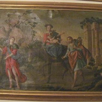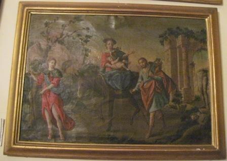 - Óleo sobre lenzo que representa a Fuxida a Exipto da Sagrada Familia. A Virxe, acomodada sobre o burro nunha xamúa, vai toucada cun sombreiro da ala ancha, típico da aristocracia europea do século XVII; un anxo serve de palafreneiro, de acordo coa tradición; a pé vai san Xosé. Con marco en madeira sobredourado. Copia libre a partir dun gravado de Martin de Vos moi recorrente. Inclúe un capítulo iconográfico habitual nestas representacións: unha estatua decapitada, no extremo dereito da composición, alude ao episodio da Caída dos Ídolos recollido nos Evanxeos Apócrifos.