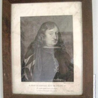 Gravado que representa a D. Juan José de Austria, fillo de Felipe IV, litografía de Agapito López de San Román (1801-7) a partir do retrato orixinal do pintor Juan Carreño de Miranda, baixo a dirección de José de Madrazo, no Real Establecimiento Litográfico de Madrid. Trátase dun dos exemplares daquel proxecto ambicioso desenvolvido por Madrazo, a chamada Colección litográfica de los cuadros del rey de España el señor don Fernando VII, que pretendía difundir as obras da colección real existentes no Museo aberto en 1819 que logo sería o Prado. Marco en madeira.