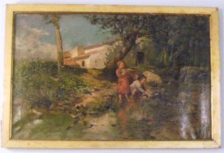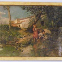 - Óleo sobre lenzo que representa unha paisaxe fluvial con nenos e ocas, asinado por Josep María Marqués García (1862-1938). Marco en madeira dourada.