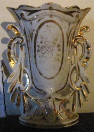 - Floreiro en forma de ánfora, tipo Imperio, en porcelana fina branca salpicada con pinceladas en dourado; nos laterais, dúas asas formando grilandas vexetais trenzadas con motivos de rocalla. Sobre pé circular exvasado e moldurado. O corpo, lotiforme, vai decorado cunha flor pentapétala orlada con motivos vexetais, todo en tons dourados.