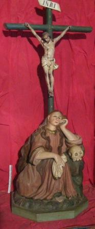 - Imaxe de María Madanela penitente aos pés de Xesús Crucificado. Madeira policromada.