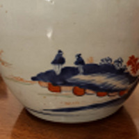 - Xarrón globular de colo corto, feito en porcelana, con tapadeira con pechadura en bronce. Policromado, representa unha paisaxe xaponesa en tons azuis e fondo branco.
