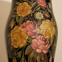 - Xarrón de corpo cílindrico e éntase no galbo, en cristal lacado en negro e decorado cun ramo de rosas, de cor rosa e amarela, e margaridas.
