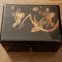 - Caixa en madeira lacada en cor negro. Na tapadeira un paxaro e motivos vexetais en dourado. Tamén ten chaves.