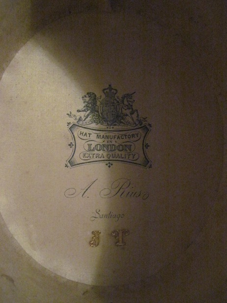 - No interior da copa: HAT MANUFACTORY IN LONDON EXTRA QUALITY A. RIUSO SANTIAGO J.T.
