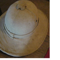 - Sombreiro masculino tipo Salacot, ou casco de médula, como se lle chama, feito en cortiza forrada en tea de cor beixe. Lixeiro e de bomba en forma de campá, con viseiras na parte frontal e posterior, co seu casquete adornado cun botón, e os orificios de rigor para a aireación. Conserva tamén a banda ou puggaree.