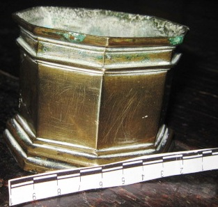 - Salvadeira en bronce dourado de corpo octogonal, coa súa boca lixeiramente exvasada e base moldurada.