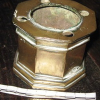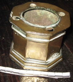 - Salvadeira en bronce dourado de corpo octogonal, boca e pé lixeiramente exvasados e moldurados. Non conserva a tapa coas correspondentes perforacións. O borde conta con catro buratos para as plumas.
