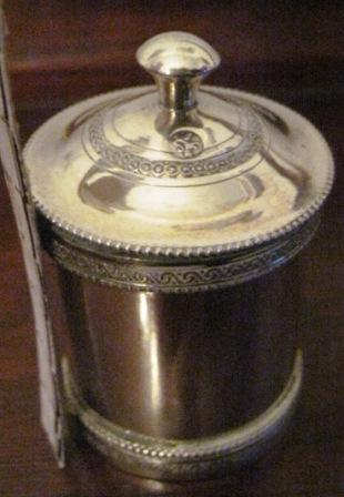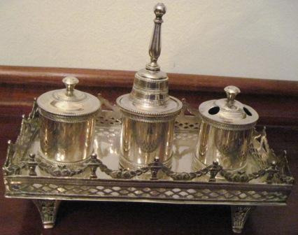 - Tinteiro en prata de corpo cilíndrico decorado no imóscapo e sumóscapo con cadansúa cenefa de motivos xeométricos. Tampa en forma de media laranxa moi rebaixada, con cenefa repuxada de láureas dispostas en grilanda, arista concéntrica e botón no remate. Na mesma tapa, o punzón cordobés: león rampante con cola eseada nun cartucho ovoide. Do prateiro cordobés Castejón, marcada polo contraste Torre (véxase a peza 473)