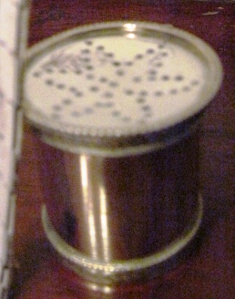 - Salvadeira en prata de corpo cilíndrico, de boca e pé exvasados. Leva cenefas repuxadas de láureas dispostas en grilanda nas divisións do corpo. A tapa superior con buracos que debuxan unha flor hexapétala. Na mesma tapa, o punzón cordobés: león rampante con cola eseada nun cartucho ovoide. Do prateiro cordobés Castejón, marcada polo contraste Torre (véxase a peza 473)