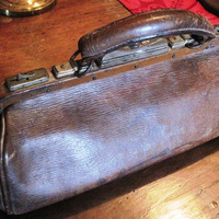 - Maletín médico feito en coiro e con dous petos interiores. Conserva a bisagra de peche en v, en metal, e a pechadura.