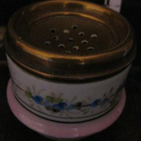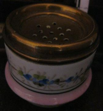 - Salvadeira en porcelana de cor rosa, corpo cilíndrico, coa tapa e pé lixeiramente exvasados. O corpo vai decorado cunha cenefa de grilandas florais feitas a pincel. A tapa en bronce con pequenos buracos. Da casa de Amable Dubourget, fabricante parisino de escribanías.