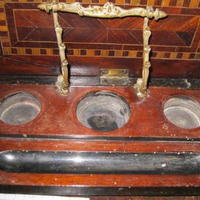 - Bandexa de escribanía en madeira con tres ocos redondos que serven para colocar o tinteiro, o portaplumas e a salvadeira; soporte en bronce para colocar tres plumas. Da casa de Amable Dubourget, fabricante parisino de escribanías.