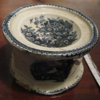 - Salvadeira en louza de Sargadelos de cor branco. Da III Época, o seu corpo é octogonal, todo él estampado en azul cobalto cunha paisaxe da serie imaxinaria, tipo Góndola.