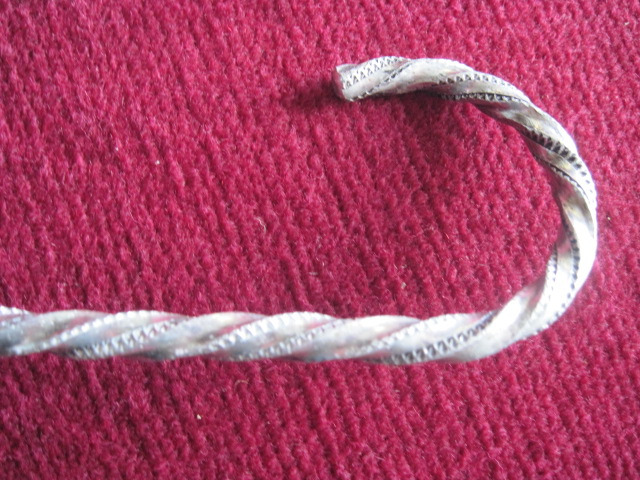 - Antuca con cuberta formada por oito panos de seda negra e oito variñas metálicas con remates de aluminio prateado. Mango de aluminio tallado, espiraliforme, con motivos decorativos nos bordes da espiral da empuñadura. Conteira de metal prateado.