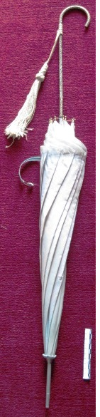 - Antuca con dez baleas coa empuñadura en aluminio dourado e tea en nylon de cor azul pálido. Enganchada á empuñadura, unha borla. Regatón de metal.