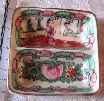 - Cinceiro de cerámica de Macao, en forma cadrada con dous ocos separados pola metade, coa representación dunha paisaxe chinesca e flores en tons verdes e rosas.