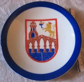 - Cinceiro en cerámica de O Castro de cor branca con orla azul e escudo heráldico central da cidade de Ourense (campo de prata, sobre ondas de azur e prata, ponte de cino arcos de ouro, sumado na destra por un castelo de ouro, almenado, mazonado de sable e aclarado de gules e, a sinistra, león rampante armado, unllado e ligunado de ouro que levanta unha espada do mesmo metal e, no centro do xefe, unha coroa real pechada.