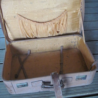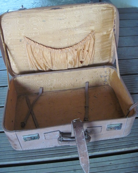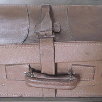 - Maleta feita en coiro marrón claro con asa e peches de metal e coas esquinas redondeadas.